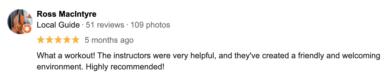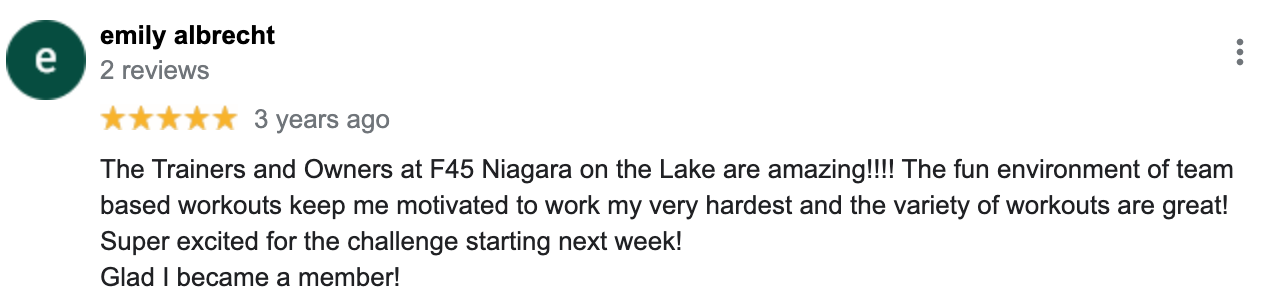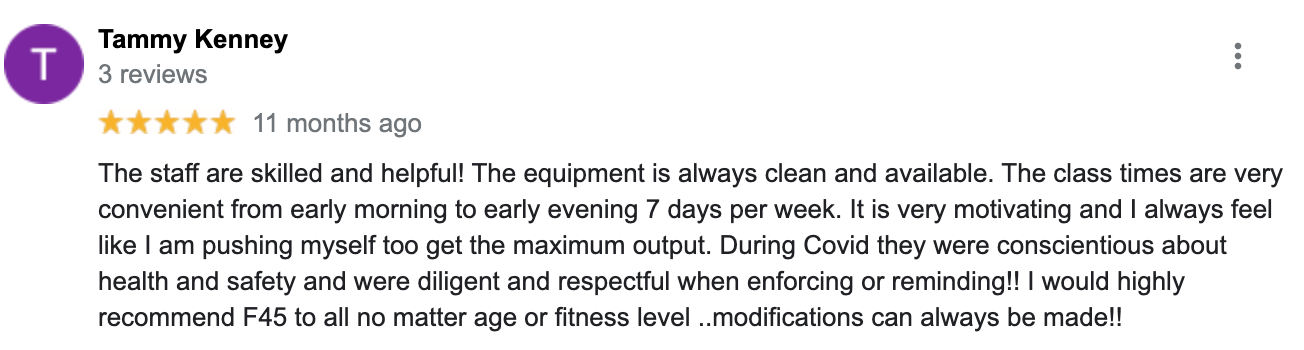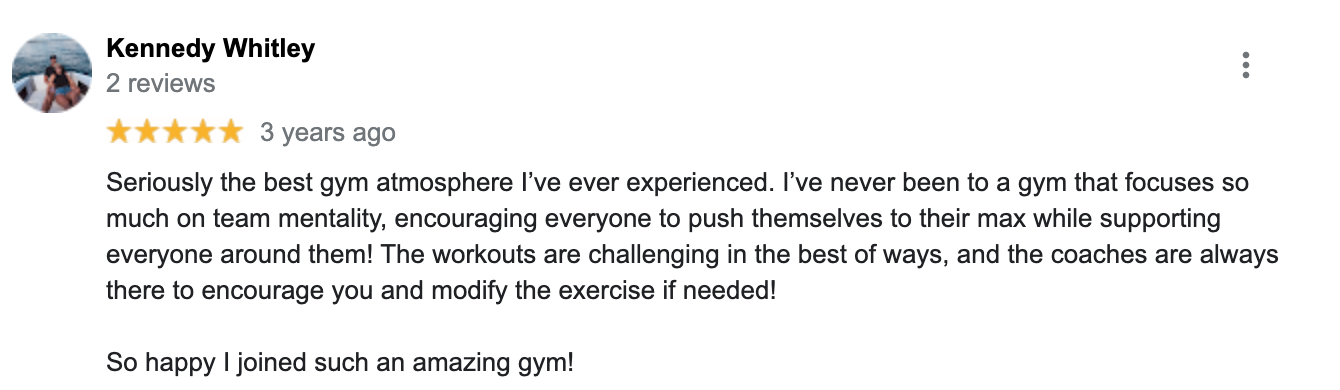 "The coaches are fantastic. They are encouraging and helpful. The workouts are adaptable to everyone no matter where you are in your health journey. The variety of workouts and movements are perfect for actually feeling it and giving you the best endorphins possible. The overall atmosphere is fun, positive, and uplifting. A great place to be!